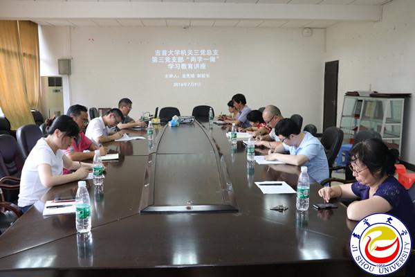 (研究生处 肖宪平)7月9日下午,在学校政务中心301会议室,校党委委员、副校长龙先琼为研究生处、信息网络中心、招生就业处组成的机关三第三支部全体党员上了一堂催人奋进的专题党课。龙先琼结合习近平总书记“七一”讲话的重要精神,以“认真学习党章,严格遵守党章”为主题,从党章的性质和作用、新党章的特点、严格遵守新党章三个方面进行了全方位的解读。